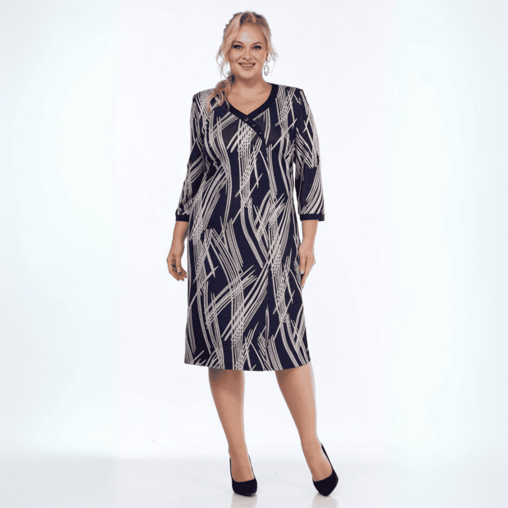 Con un corte midi que realza las curvas en la medida justa, presenta un estampado gráfico moderno y sofisticado, perfecto para quienes aman destacar con estilo y seguridad.